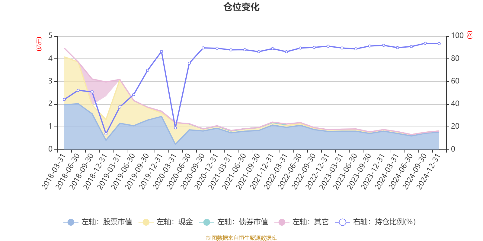据定期报告数据统计,近三年平均股票仓位为90.54%,同类平均为79.89%。2024年三季度末基金达到93.72%的最高仓位,2018年末最低,为13.93%。