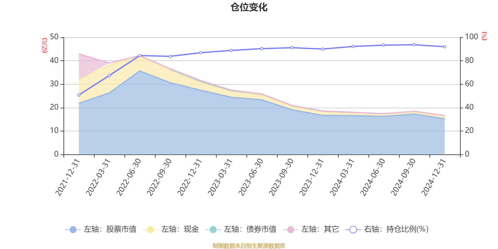 据定期报告数据统计,近三年平均股票仓位为87.86%,同类平均为87.17%。2024年三季度末基金达到93.72%的最高仓位,2021年末最低,为50.79%。