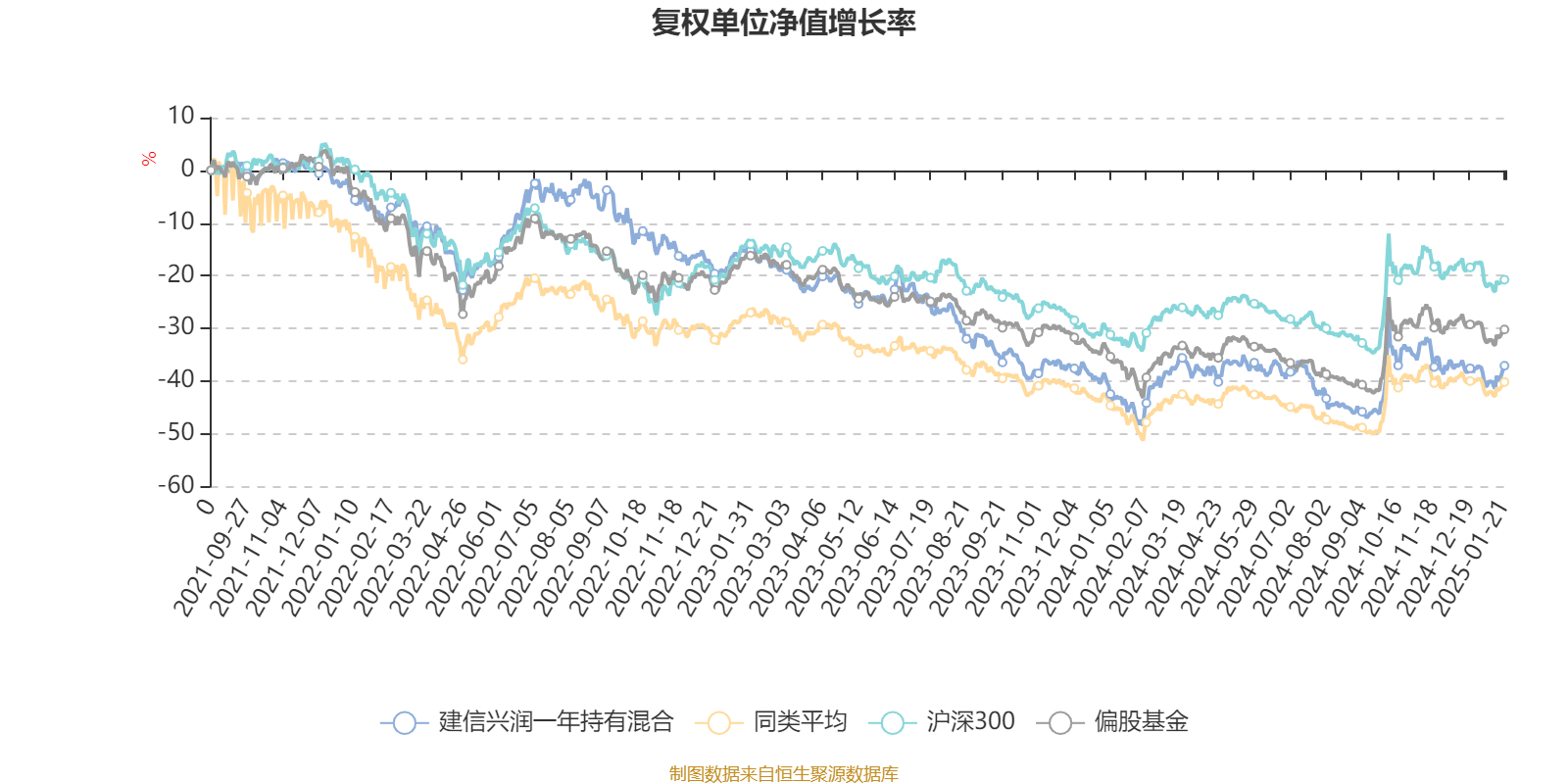 截至1月21日,建信兴润一年持有混合近三个月复权单位净值增长率为-4.91%,位于同类可比基金174/210;近半年复权单位净值增长率为3.90%,位于同类可比基金155/210;近一年复权单位净值增长率为12.80%,位于同类可比基金118/210;近三年复权单位净值增长率为-31.98%,位于同类可比基金135/194。
